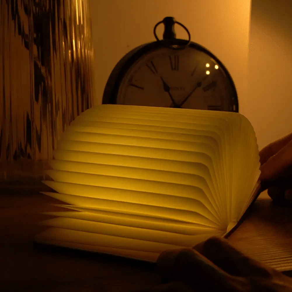 Boklampan™ är en elegant och unik belysning formad som en bok, med riktiga papperssidor som sprider ett varmt och behagligt sken. Den smarta magnetstängningen gör att den kan vikas helt runt, medan USB-laddning gör den både praktisk och portabel. En perfekt kombination av stil och funktion – för varje rum i hemmet.